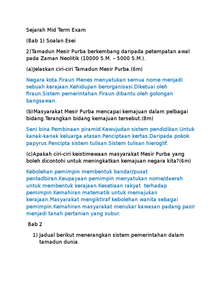 Sejarah Mid Term Exam Sejarah Mid Term Exam Bab 1 Soalan Esei 2 Tamadun Mesir Purba Berkembang Daripada Petempatan Awal Pada Zaman Neolitik 10000 S M Course Hero