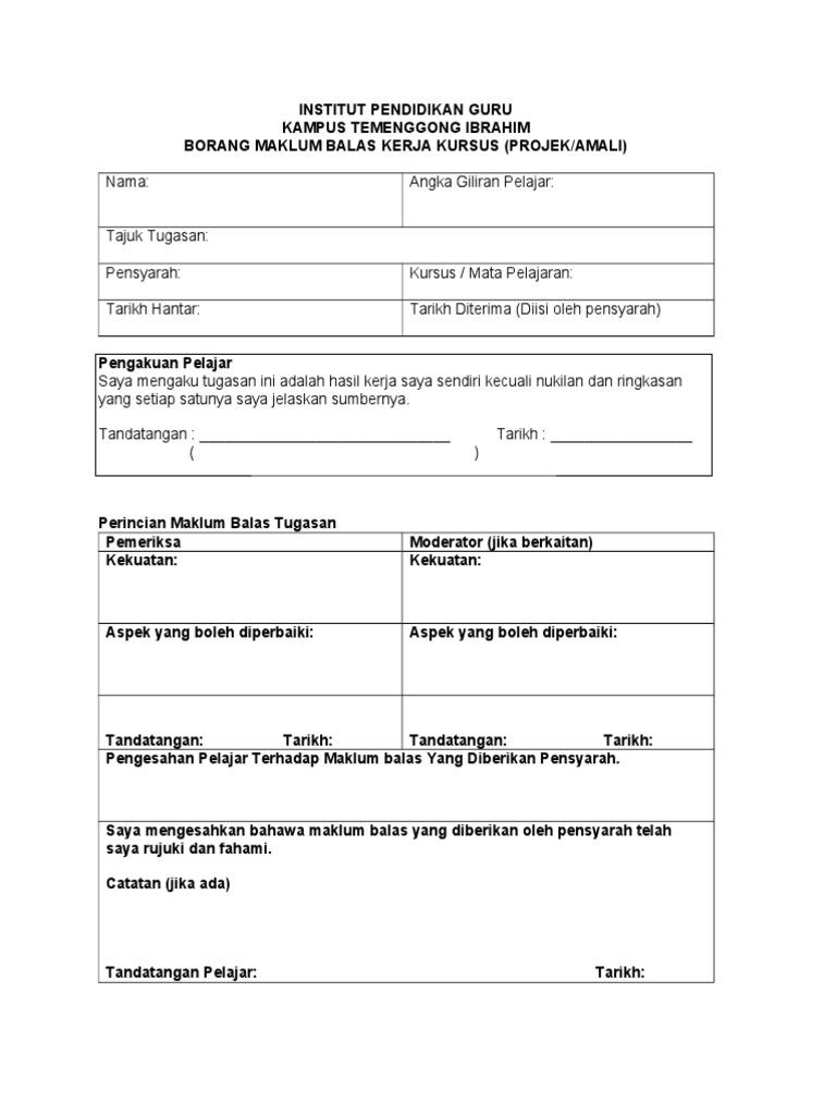 Doc Institut Pendidikan Guru Kampus Pulau Pinang Borang Maklum Balas Kerja Kursus Projek Amali Edup 3053 Academia Edu