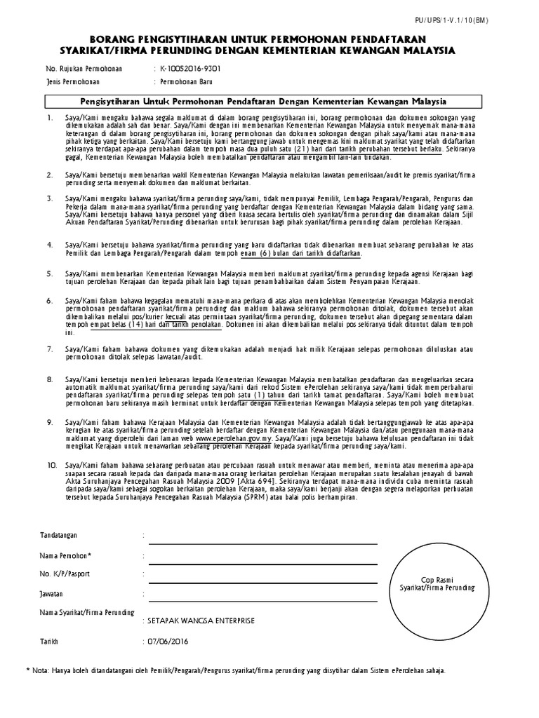 Borang Pengisytiharan Untuk Permohonan Pendaftaran Syarikat Firma Perunding Dengan Kementerian Kewangan Malaysia