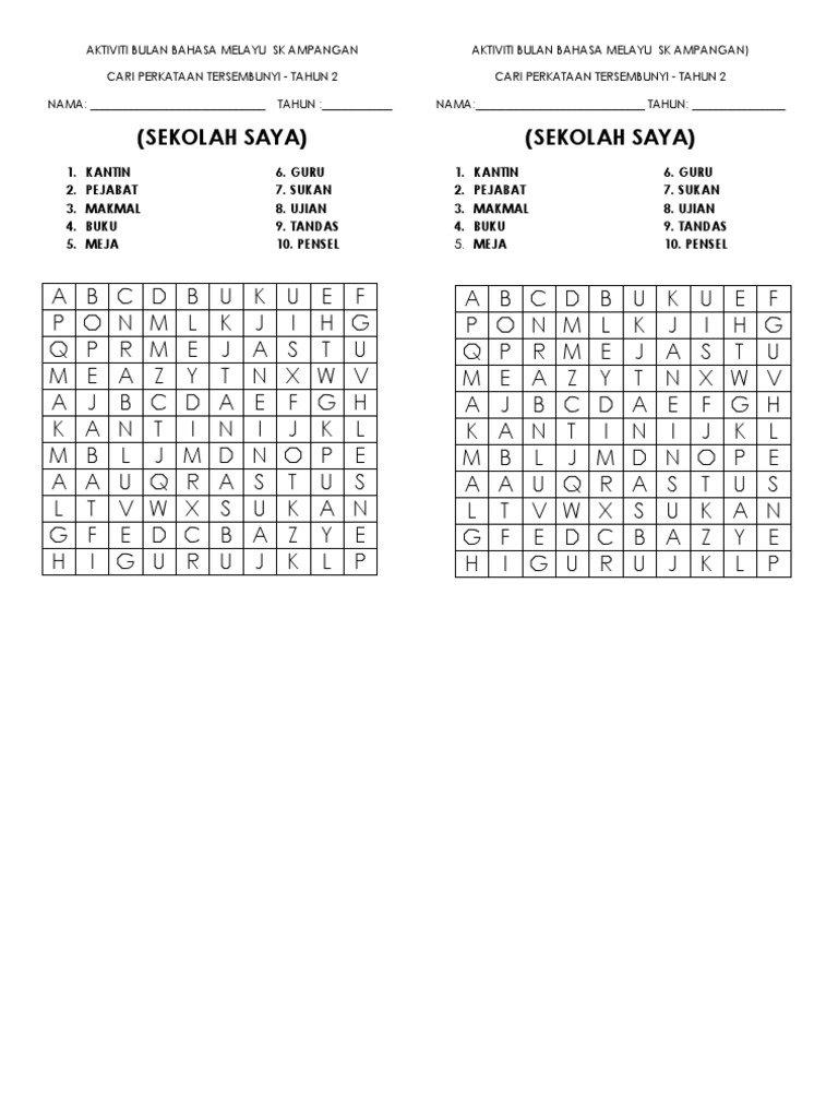 Cari Perkataan Tersembunyi Bahasa Melayu Tahun 2