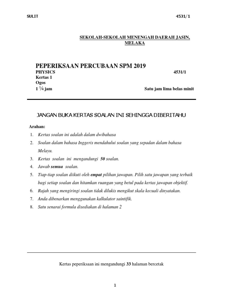 Fizik K1 Percubaan Daerah Jasin 2019