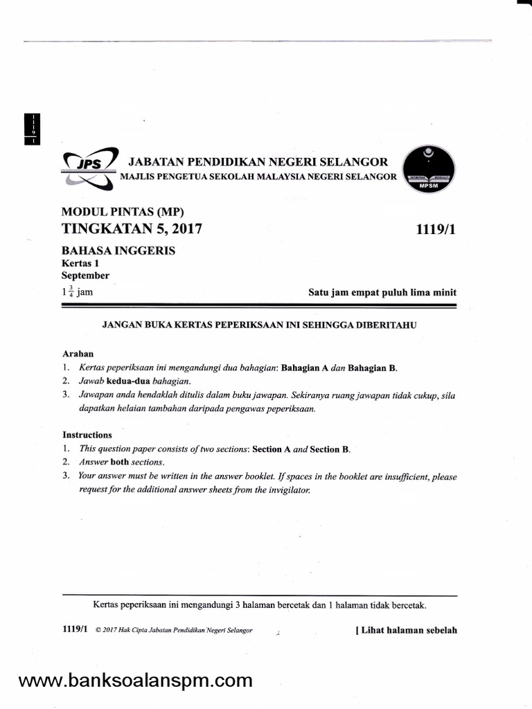 Soalan Percubaan Spm 2018 Bahasa Inggeris Selangor